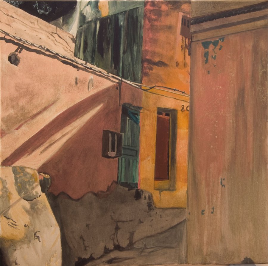 À travers ces œuvres de Montpellier et ses environs, passant par l’Espagne et arrivant au Maroc. En allant vers le sud, le soleil s’intensifie et les couleurs prennent de l’éclat. Par le biais de ces peintures j’ai essayé de me pousser plus loin dans l’impressionnisme, dans des proportions plus grandes, et des couleurs plus vives. Quand j’ai commencé cette série je ne savais pas encore que j’étais enceinte et sans faire exprès j’ai peint 9 tableaux, ce chiffre magique des mois de gestation.